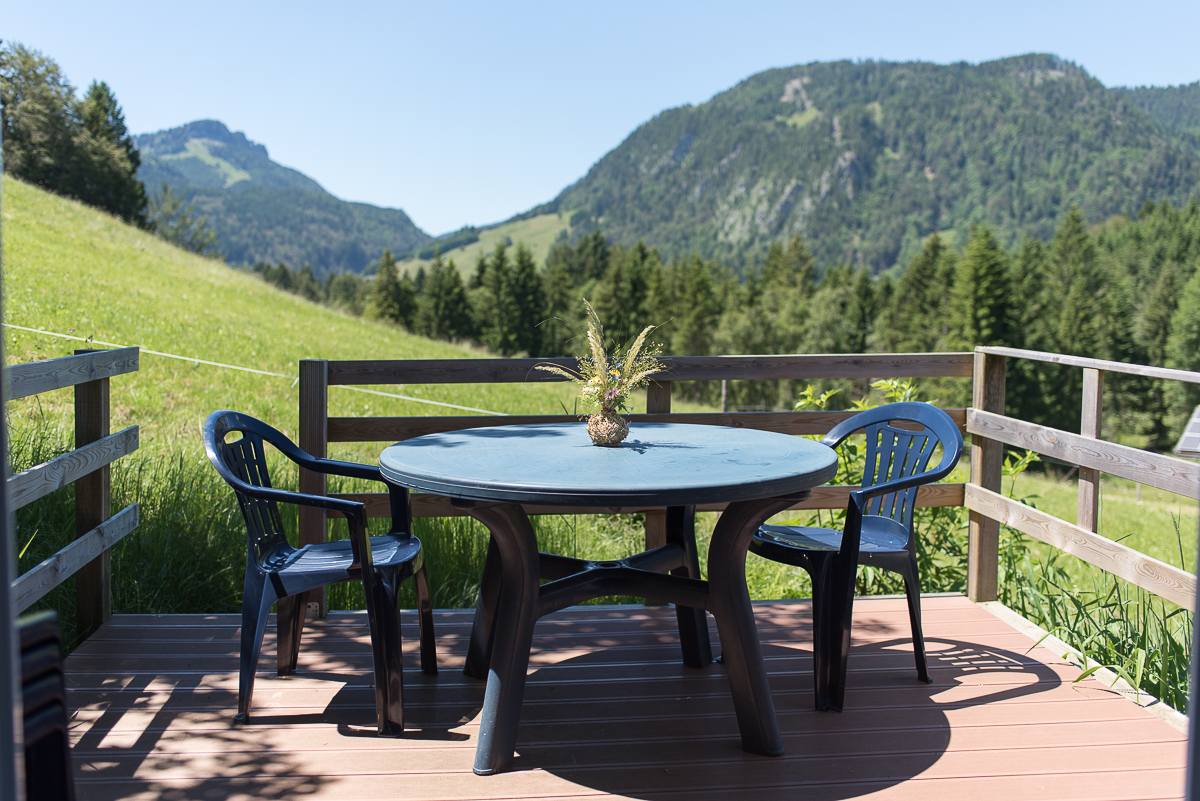 Frühstück auf der Terrasse. Du siehst: Wiesen und Berge. Du hörst Kuhglocken und den Jubel der inneren Stimme; auf geht’s, dieser Tag wird eine helle Freude!