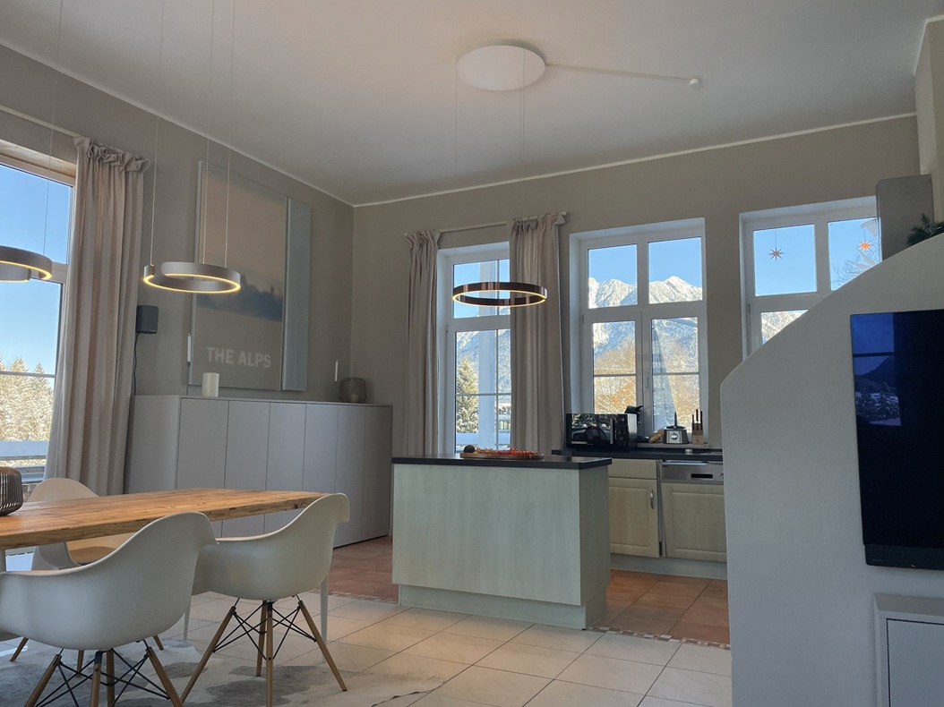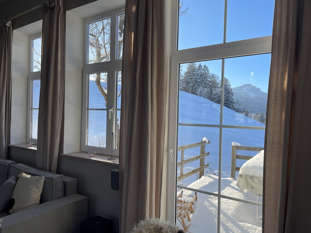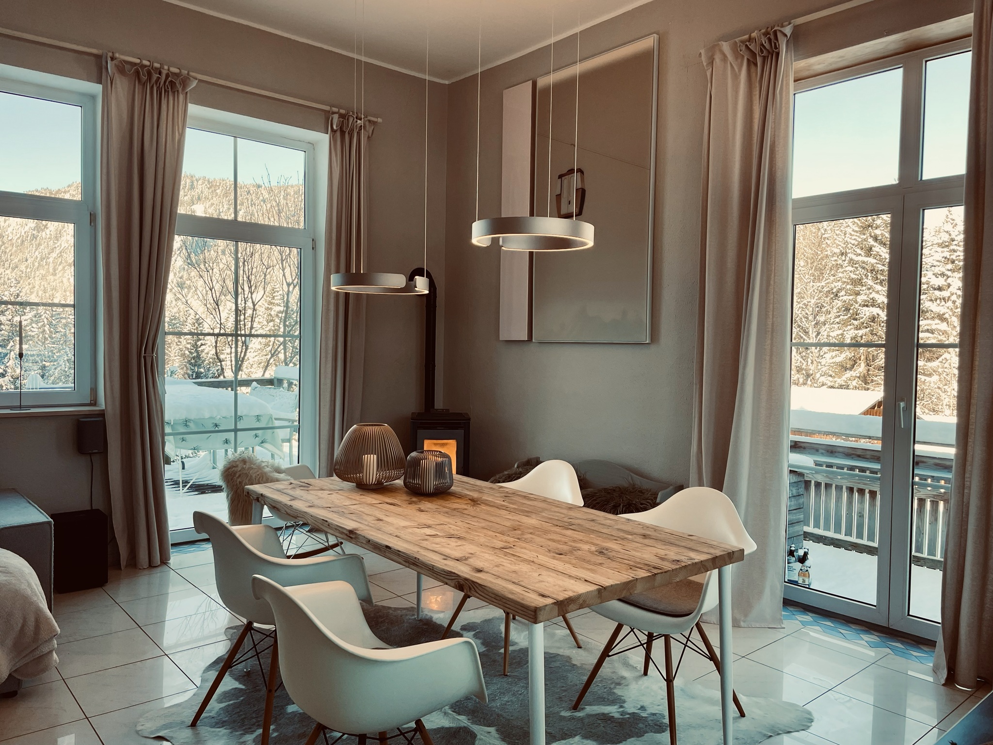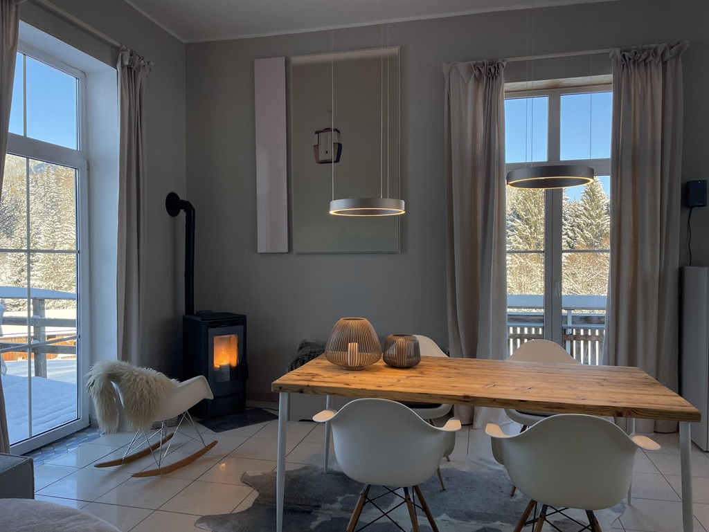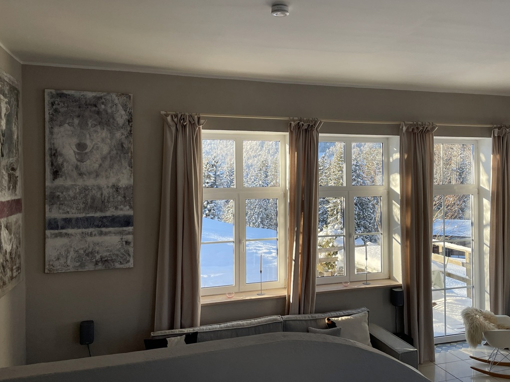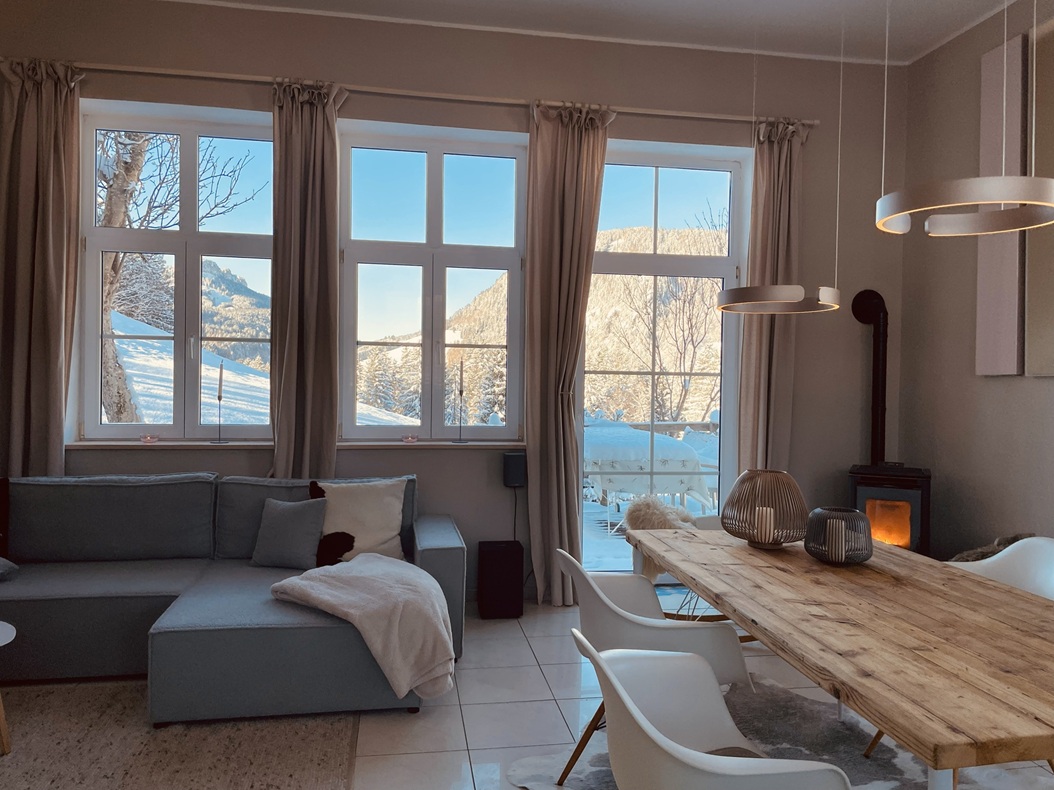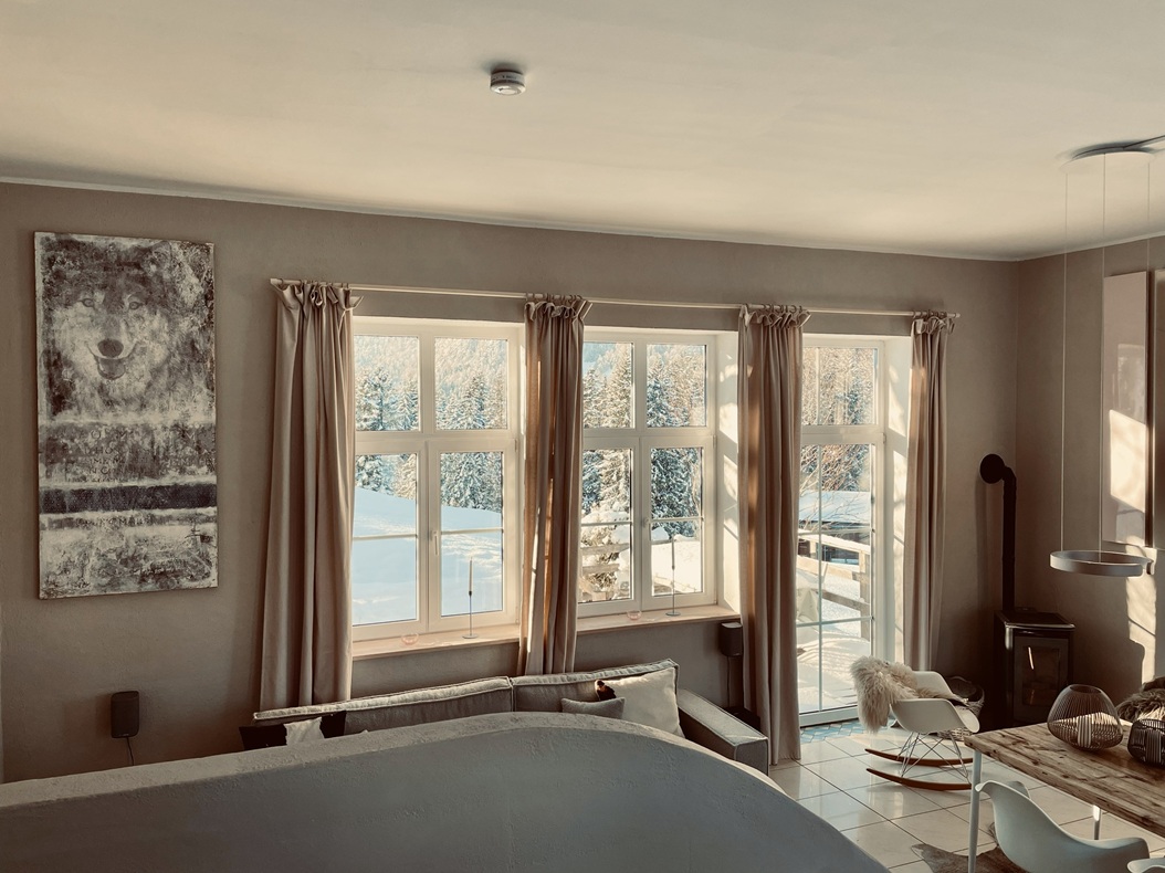 Falls du mal gar nicht vor die Tür willst: Lümmle einfach vor den großen Fenstern am Kamin und genieße den Bergblick. Ansonsten: Breitband-Internet, OLED-TV und entspannt viel Platz.